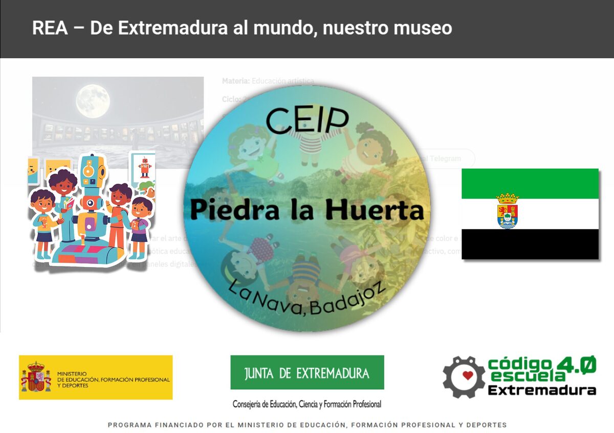 El REA (Recurso Educativo Abierto) seleccionado para el desarrollo de este programa es De Extremadura al mundo, nuestro museo donde el alumnado explorará el arte de distintas épocas y creadores regionales, recreando obras con técnicas de color e investigación. A través del pensamiento computacional y la robótica educativa (Micro:bit, Scratch y secuenciadores), desarrollarán un museo interactivo, combinando sus creaciones artísticas con audioguías y animaciones en paneles digitales. Nos ha parecido muy útil para nuestro proyecto de Red de Escuelas Emprendedoras y por eso lo hemos elegido.