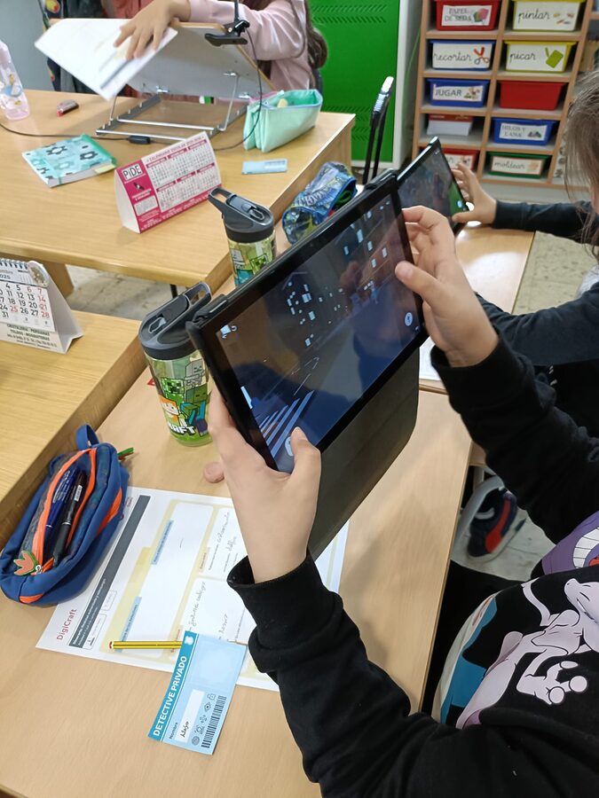 Hemos creado un videojuego, inventando nuestros propios obstáculos y diseñando un personaje que tiene que recorrer el escenario. El personaje se dibuja y recorta sobre una hoja de papel. Para interactuar con el videojuego se usa la cámara de la tablet, que reconoce el personaje y detecta cuando choca con los objetos y obstáculos de la pantalla.